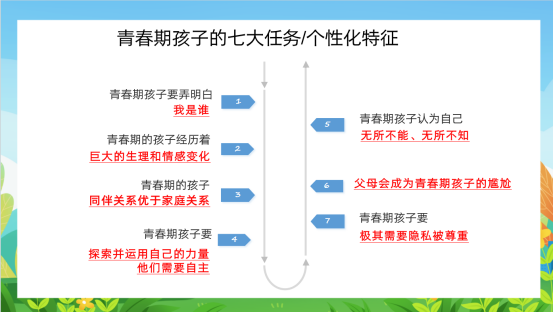 陈老师带着家长们回忆各自青春期时曾做过的那些事,介绍青春期孩子的七大任务和个性化特征,帮助家长们看见青春期的孩子的“判逆”只是青春期孩子的发展特点。
